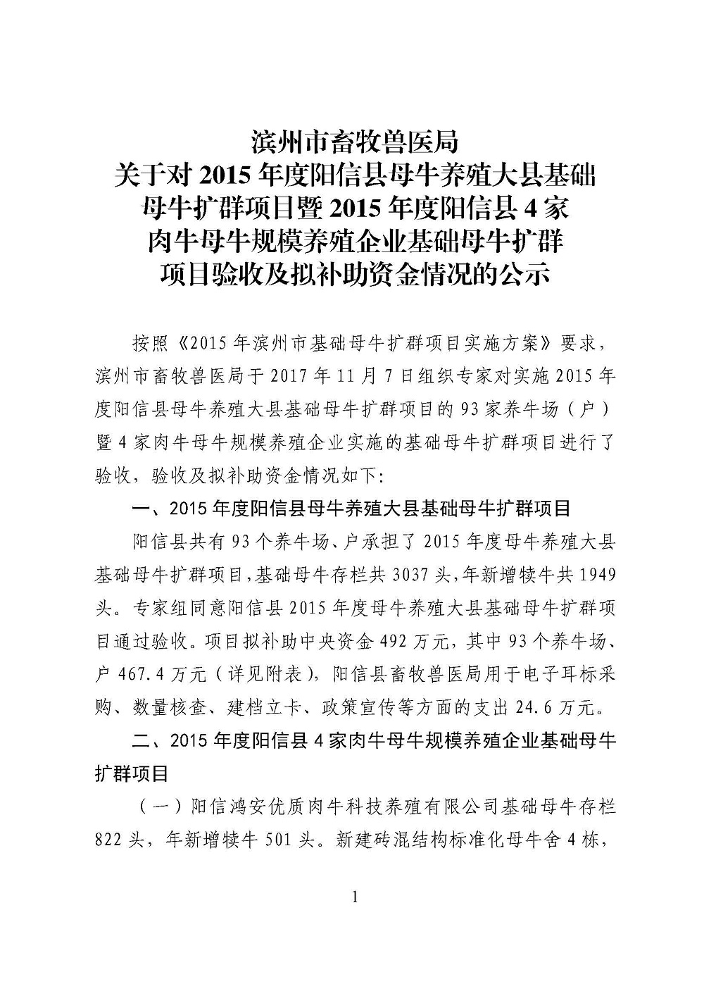2015年度阳信县母牛养殖大县及4家规模企业拟补助资金情况公示