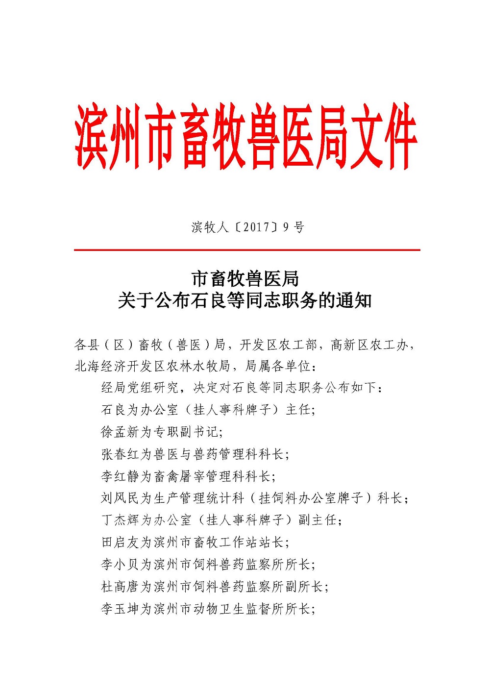 滨牧人〔2017〕9号(关于公布石良等同志职务的通知)